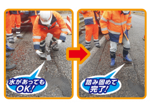常温合材を片手でも扱えるサイズに袋詰めした投げ込み式の全天候型ポットホール用緊急補修材料。 袋内の混合物はカットバック系アスファルト混合物であり耐久性が高く車両走行により徐々に均されることで、...