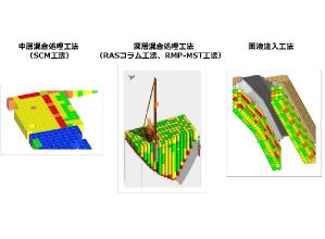 深層・中層混合処理工および薬液注入工における計画から施工結果まで一連の情報を3次元で可視化するシステム。