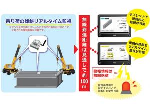 桁等の吊荷や重機等に無線式傾斜計を取り付けて傾斜をリアルタイム監視する安全支援システム。