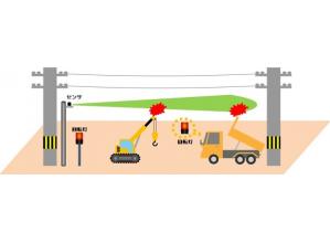 架空線切断等の警戒エリア監視において、面的レーザを照射して機械や人の侵入を監視し、回転灯や音声で通知するシステム。