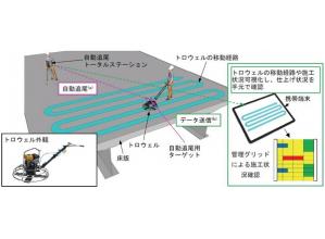 コンクリート床版表面仕上げのトロウェル等について、自動追尾式トータルステーション(TS)を用いて軌跡管理するシステム