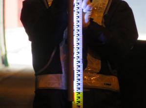 夜間やトンネル内工事でのレベル測量において、暗所部でも目盛数字が読み取り可能となるスタッフ横付け照明器具