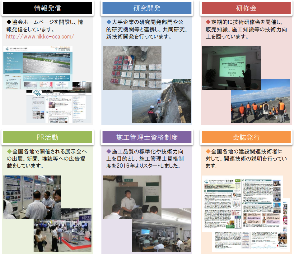 クリスタルコンクリート協会は1997年に塗料メーカーである株式会社日興とその施工代理店を中心に発足した組織です。無機系材料を主とするコンクリート表面保護材等関連技術を取り扱う情報交流の場としてスタートしました。