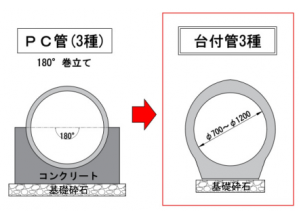 高土被り部の埋設管工事において、管と基礎が一体化した形状でコンクリート巻立て不要な高強度パイプカルバート(台付管3種)を適用する技術。