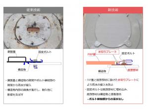 鋼製橋脚・桁向けの止水構造付きFRP製マンホール蓋と接着剤を用いた接合方法。