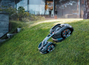 境界ワイヤーからのパルス信号により自律走行を可能としたロボット型バッテリー動力式芝刈り機。