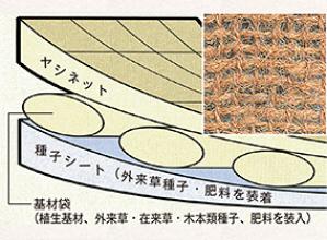 牧草による早期緑化を行いながら、低木類を成立させ、安定した植生によるのり面保護を目的とした軟岩I・硬質土壌用植生マット。