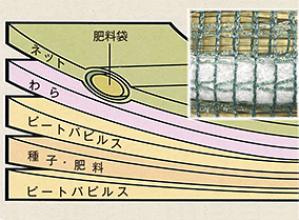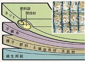 高い侵食防止機能を持ちながら、M10型は約1000g/㎡、M5型は約500g/㎡、M2型は約200g/㎡の土壌改良材を装着し、水分条件、肥料条件を向上させた切土用の植生マット。