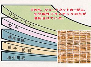 ワラ・不織布の侵入防止効果を最大限に発揮。ワラのメリット(侵食防止効果、断熱性、保水性、環境保全)と特殊な不織布の侵入防止効果で土壌や種子の流出を防ぐ。ユーザーの要望により開発された。
