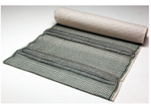侵食防止機能を強化した人工芝。侵食防止用の不織布が、地面に密着して土粒子を抑えるので、土砂の流出を防ぐ。また植物が突き抜けて生育することが可能。