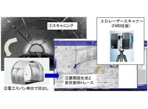トンネル点検で実施される近接目視、打音結果、触診で覆工にマーキングされた変状の形状や寸法について、三次元レーザースキャナを用い三次元点群データとして高精度かつ高速に取得および解析する技術。