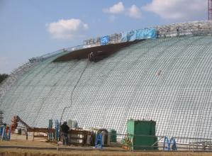 国産スギ、ヒノキ樹皮を低温粉砕し急勾配の屋根、屋上、法面等工事に適用可能な工法