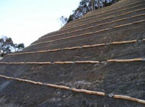 間伐材にワイヤーロープを通し数珠状にしたものを法面に階段状に設置することで緑化を促進する植生基盤工法。自然種子を取り込み、自然の姿を復元する待ち受け型緑化を実現。 また、鉄筋挿入工と組み合わせ...