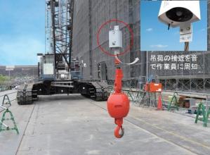 クレーンのワイヤー及びフックに取り付けた音による警報装置で作業員に吊荷通過を周知するシステム。