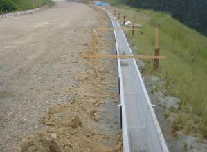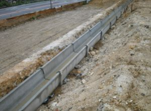 法面小段排水路と小段歩道擁壁が一体化した擁壁。擁壁前面にU240型水路、擁壁天端面に歩道柵用穴を設置。