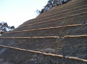間伐材にワイヤーロープを通し数珠状にしたものを法面に階段状に設置することで緑化を促進する植生基礎工法。自然種子を取り込み、自然の姿を復元する待ち受け型緑化を実現。 鉄筋挿入工と組み合わせ、鉄筋...
