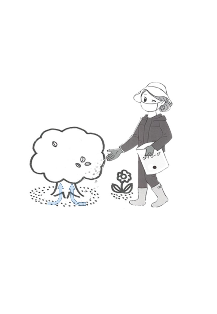 粒剤なので風等の影響による薬剤の飛散もほとんど無く、臭いも少なく気にならない。そのまま散布するだけなので散布器具も必要無く、いつでも手軽に散布することができる。臭いが少ないので、花き類や室内の観葉植物にも使用できる。ミツバチや天敵には影響が少なく、長期間効果の持続が期待できる。