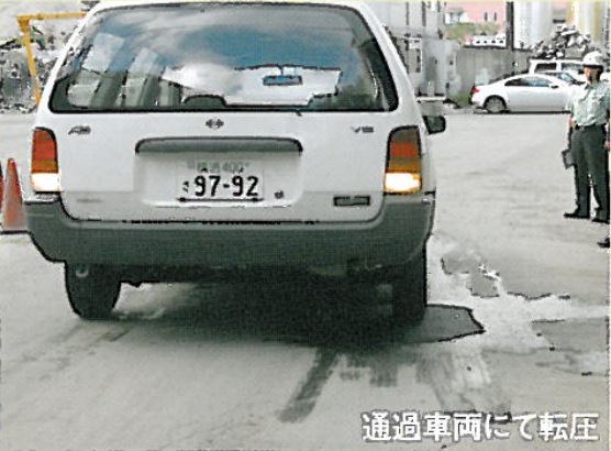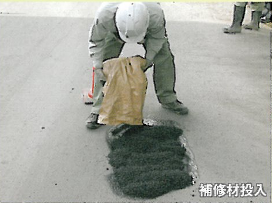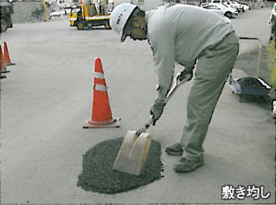 踏み固めて水をかけるだけで固まる新しいタイプの袋詰めアスファルト合材。硬化が速く、通常の加熱ア...