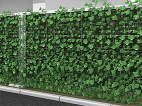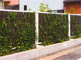 効果的な植物の生育に適した緑化フェンス。登ハンマットに付着型つる植物(ヘデラ類)が吸着しながら生育し、より確実な登ハンが期待できる。3Dメッシュにより植物の落下も防止。