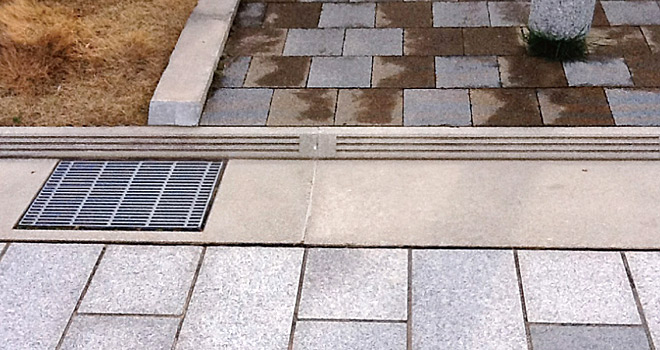 ・宅地への雨水の浸入を防ぐ乗入がついたガッター一体型側溝(PREVENT RAIN:雨水浸入を防ぐ)。