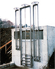 河川、かんがい用、分水用、取水用として特に考案されたのが、AG型スルースゲートである。AG型スルースゲートは、本体(扉体、戸当)を鋳鉄製とし水密と腐蝕防止を図り、フレームと巻上機、スピンドルを組み合わせたもの。価格が安く、取付けが簡易なゲートである。