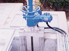 万一の事故等により緊急に排水口を遮断する目的で考案されたのが、緊急遮断スルースゲート。事故の場...