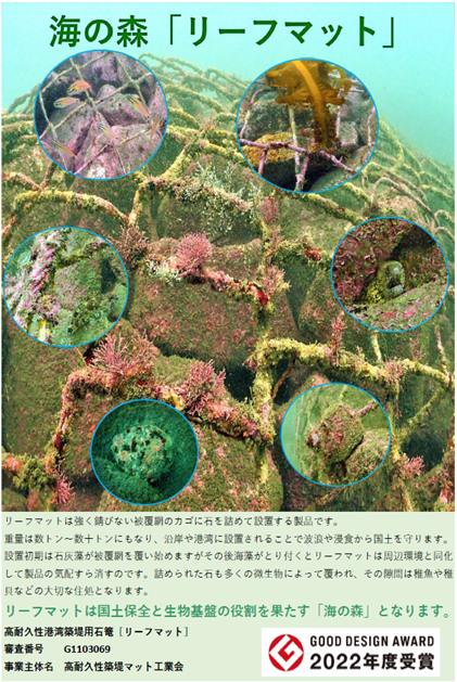 鋼線と被覆樹脂は接着強度70N/㎝以上で接着され、被覆部が損傷しても心線の錆びを防ぐ。この性能により海中でも50年以上の耐久性を有し、吸出防止、洗堀防止、消波ブロックの沈下防止等様々な用途で採用されている。製品の基本型式である3㎥型と6㎥型以外のサイズも製造可能。また海中に設置されたリーフマットはその多孔質構造により魚介類の住処や藻場として機能することから「海の森」として2022年度のグッドデザイン賞を獲得している。