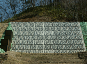 1個当たりの製品面積が1㎡の大型ブロックのため、安全性・施工性に優れ、工期を短縮できる。 胴込めコンクリートをブロックの接合部分に打設することによりブロックが一体化され、より強固な擁壁が構築できる。
