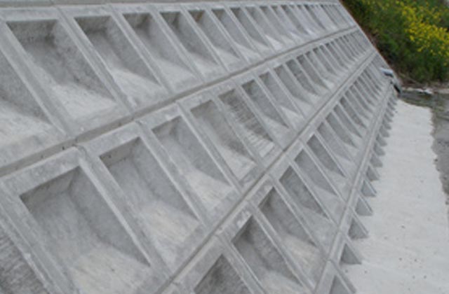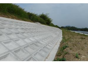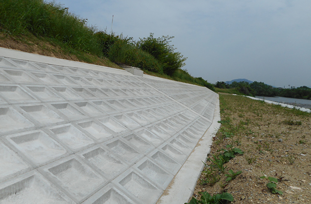 法面保護工のブロック張工に用いる土木用のコンクリートブロックで、主に河川、ため池、道路等の緩やかな法面に敷設し、法面の風化、浸食、崩壊を防止するために用いられる。