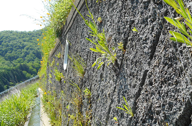 ・全体がポーラスでできており、空隙が水や空気及び植物根を通すことができるため、護岸上に植生が可能。
