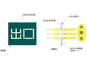 標識標示面の文字等の白色部分を切り文字加工し、裏面より透過性のある反射シ−トを貼り付けた透明メタクリル樹脂板を当て、その部分より逆光時に太陽光を透過させて視認性を確保する標識。
