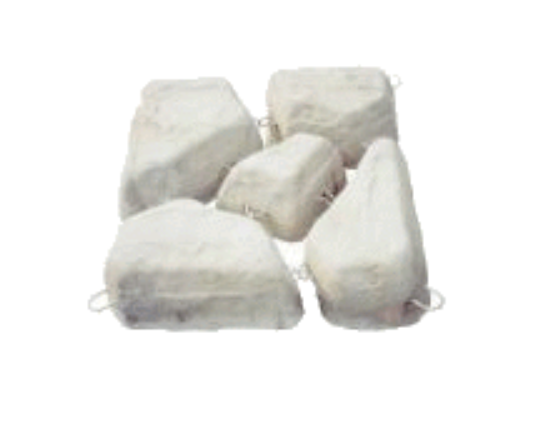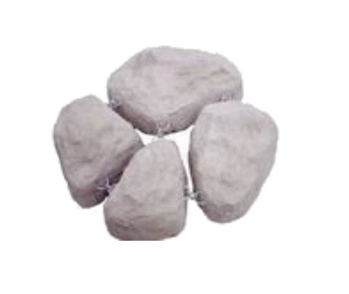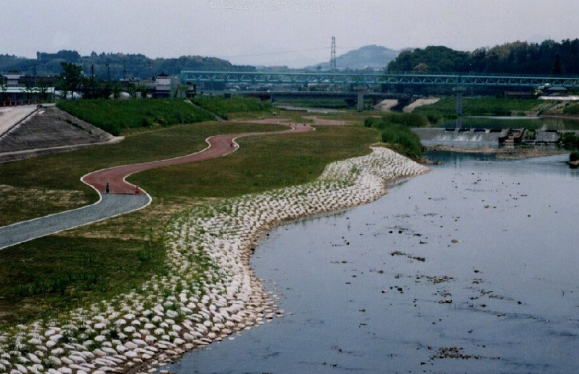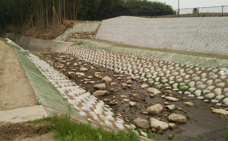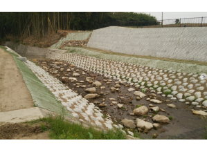 自然と融和する擬石ブロック。擬石形状なので、自然な景観の護岸となる。屈とう性のある構造により、どのような形状の現場にも順応できる(Bタイプ)。表面の覆土と背面が連続するので、自然な植生の回復を促す。