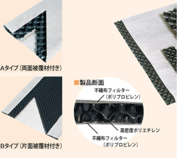 ・フィルター材は、いろいろな土質に対して目詰りを起こしにくい構造である。また、土中での腐食の心配がほとんどないため 長期間使用できる。
