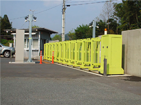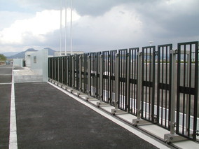 傾斜凹凸自在対応型伸縮扉、電動開閉伸縮扉など、あらゆる施工状況に対応する業務用門扉。1枚1枚が独立したパネルユニットになっており、部分的破損はパネル交換のみで良く、修復も経済的。