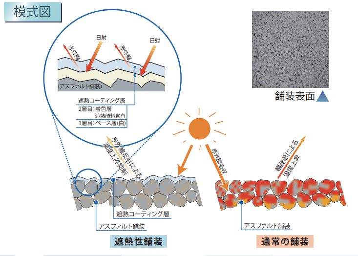 遮熱性舗装「ヒートオフペイブ」、保水性舗装「ホスイペイブ」は照返しや気温の上昇を低減し、環境の改善につながるため、都市問題である「ヒートアイランド」対策として注目されている舗装である。