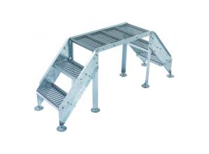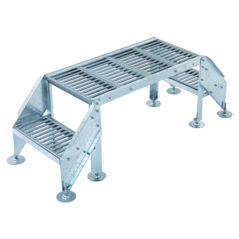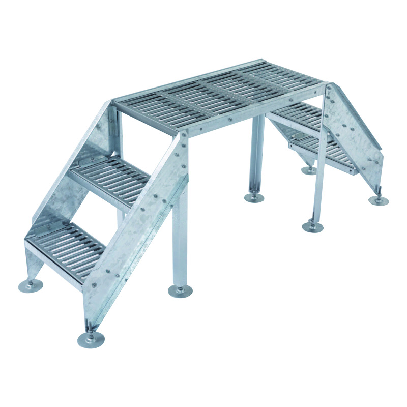 屋上などのケーブルラック、各種設備配管設備等の上を横断するための歩廊。組立式となっており現場への挿入が容易。延長キットや踏み台キット、手すりなど豊富なラインナップで様々な現場状況に対応可能。新商品では、キュービクルの扉前に対応する1200wの商品も追加。