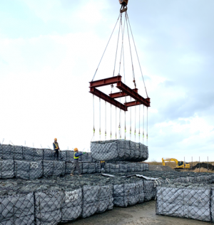 リーフマットは、引張強度1,000N/㎜2以上の亜鉛アルミ合金めっき鋼線をポリエチレンアイオノマー樹脂で被覆した線材で製造される、耐久性と強度に優れた石カゴである。鋼線と被覆樹脂は接着強度70N/㎝以上で接着され、被覆部が損傷しても心線の錆びを防ぐ。この性能により海中でも50年以上の耐久性を有し、吸出防止、洗堀防止、消波ブロックの沈下防止等様々な用途で採用されており、製品の基本型式である3㎥型と6㎥型以外のサイズも製造可能である。また海中に設置されたリーフマットはその多孔質構造により魚介類の住処や藻場として機能することから「海の森」として2022年度のグッドデザイン賞を獲得している。