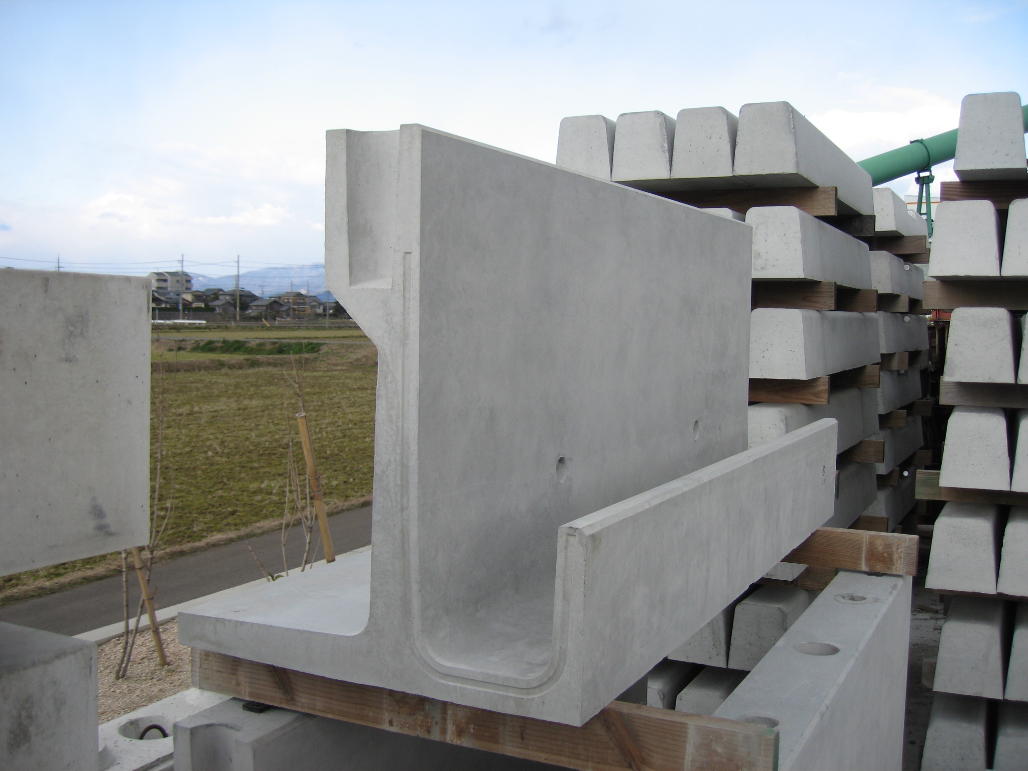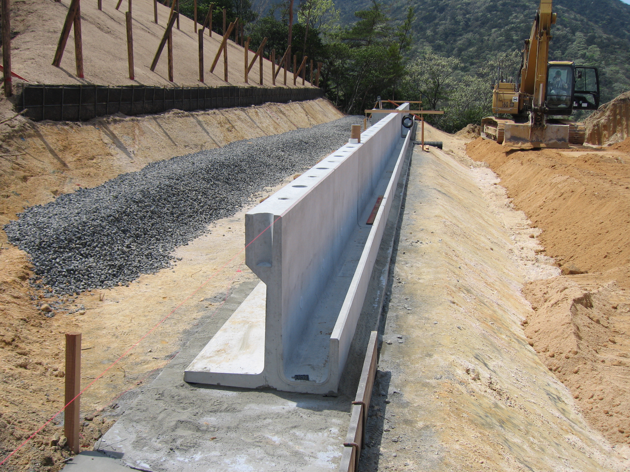 法面小段排水路と小段歩道擁壁が一体化した擁壁。擁壁前面にU240型水路、擁壁天端面に歩道柵用穴を設置。