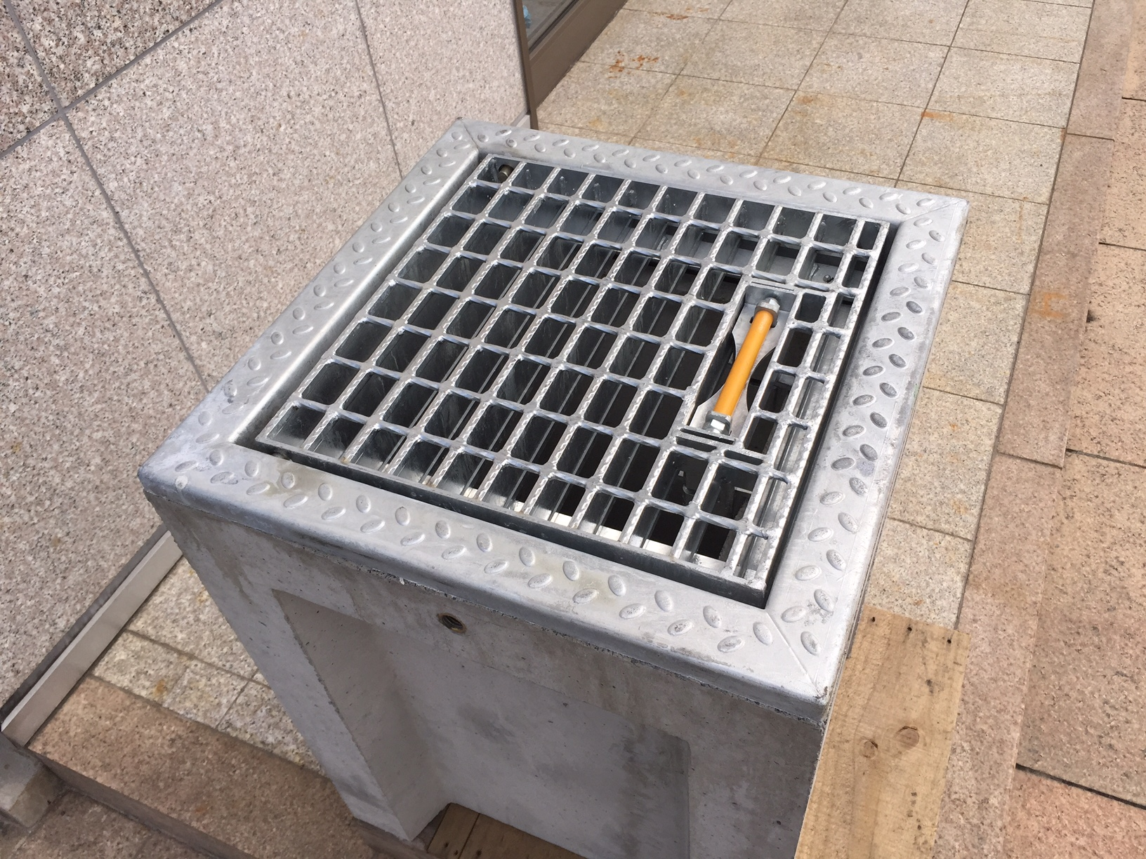 VS桝は自由勾配側溝(VS側溝)と総幅が同じで、マスの張り出しがない。グレーチングにはノイズレスゴムを装着し、騒音防止効果あり(110°開閉及び落し込み型)。ゴミ籠をセットすることで、ゴミをマスの中に落とさない。