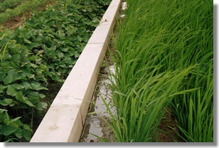 断面形状として台形形状を採用。これにより、雑草の生える余分な窪みがない。また、台形であることから、作業機械が接触しても引っかかったり、ブロックが壊れたりすることがなくなる。さらに、従来ブロックに比較して天端幅を広くすることで、作業時の歩行性を向上させた。