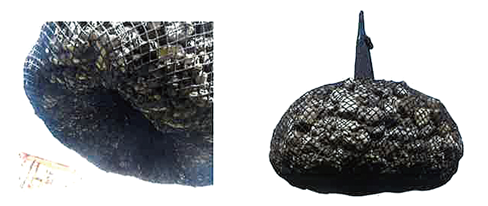 底部吊上げ構造(=ボトムリフト構造)を有した袋詰玉石工「ロックユニット」。自重により中詰め材を拘束(Lock)し、一つの岩(Rock)のようにできる。