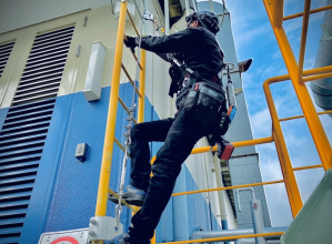 タラップ(固定はしご)の昇降時に必須の常設型転落防止システム。はしごの長さに合わせて設置が可能...