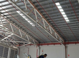 トラックの荷台での荷役作業時に必須の常設型転落防止システム。天井の梁などにワイヤーを設置し、安...