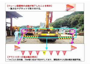 安全管理に関する技術。移動式クレーンのアウトリガー張出幅が制限される際、点検状況の見える化によ...