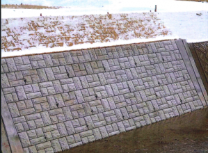 練積タイプの大型積ブロック。据付作業は重機を用いて積み上げるため、安全・容易に施工出来る。明度5.5、輝度の標準偏差(平均)14の証明を取得済みで、環境に配慮。河川、道路、砂防、治水、海岸、港湾などの護岸・土留工などに多く使用されている。小口止はプレキャスト製品を用意。1t用カップラーを使用。5分水平施工で裏型枠不要。Ⅱ型専用の基礎ブロック製品もあり。