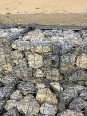 グレーチングを活用して現地で籠状に組立可能で、重機を用いて誰でも簡単に石詰めできる製品。