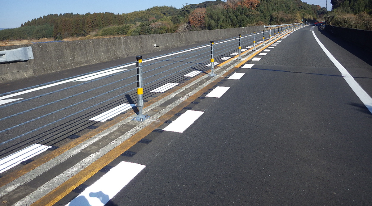 暫定2車線用ワイヤロープLD種は、ラバーポールと同等のスペースで設置が可能。現在、ラバーポールが設置されている区間に車両の突破防止効果を備えたワイヤロープLD種を設置することで道路の安全性が大幅に向上。また、道路の拡幅工事の必要がなくコンクリート基礎を設置しないことから短工期で施工することができる。