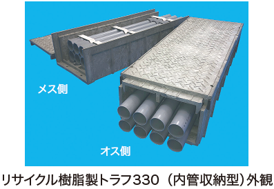 リサイクル樹脂(再生PP、PE)を主材料としたケーブルトラフ。従来のトラフと違い、二重構造の内管(VU)収納型としたことで、防鼠対策機能を付加し、ケーブルを小動物から守ることができる。