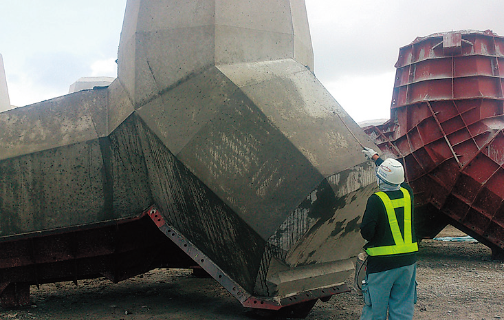 コンクリート養生時に含浸性コンクリート養生剤(サンマテラーアクアバンク)を塗布することにより、本養生剤の特徴である超微粒子成分がコンクリート内部に含浸し、不溶性で緻密な結晶組織が形成されることで、水分逸散を抑え、乾燥収縮ひび割れを低減。