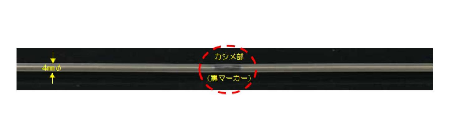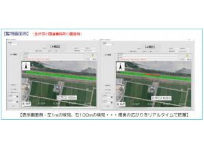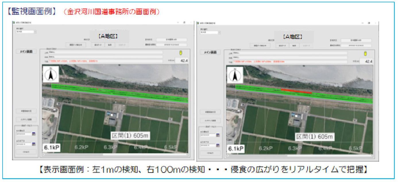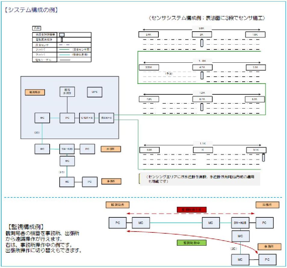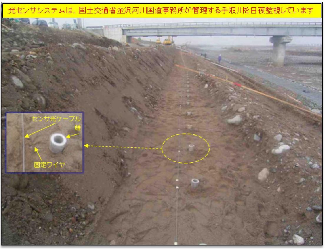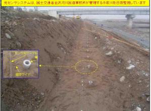 本システムは、洪水による堤防侵食で、埋設してあるセンサ光ケーブルに曲げや破断が生じたとき、その位置を事務所など遠隔からリアルタイムで検出・表示・通報する。 センサは、確実な検知のため、1m間隔でカシメを入れた構造で、カシメ部に錘を取り付けて埋設。 センサの破断時、SUS管の内部を水が走らないよう、走水防止ジェリーを充填、浸水範囲を特定し易くしている。